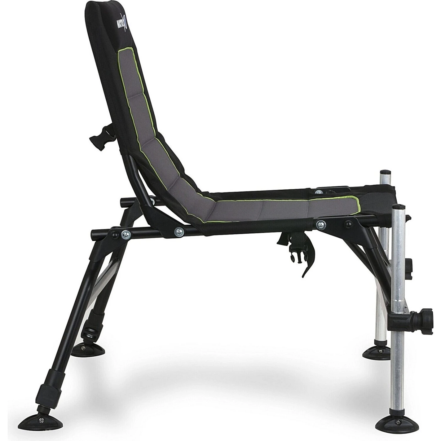 Wat deze stoel wel bijzonder maakt is dat je op de twee metalen poten aan de voorkant andere accessoires van Matrix kunt bevestigen zoals tray’s. Zowel de voorpoten als de achterpoten zijn traploos verstelbaar in hoogte zodat je de stoel perfect horizontaal kunt zetten op oneffen ondergronden.